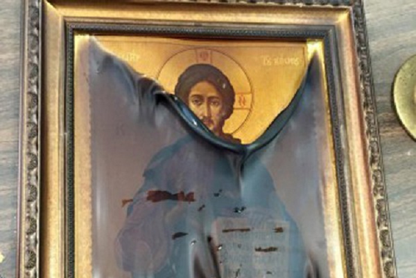 În fotografia alăturată puteţi vedea cum căldura intensă din timpul incendiului a topit materialul transparent (sticlă?) care acoperea această icoană, însă icoana propriu-zisă a rămas neatinsă.